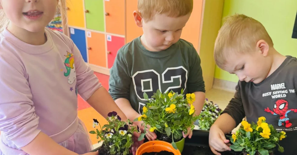 🌼 Posadziliśmy piękne kwiaty w kolorowych kaloszach, które teraz zdobią nasz przedszkolny kącik.